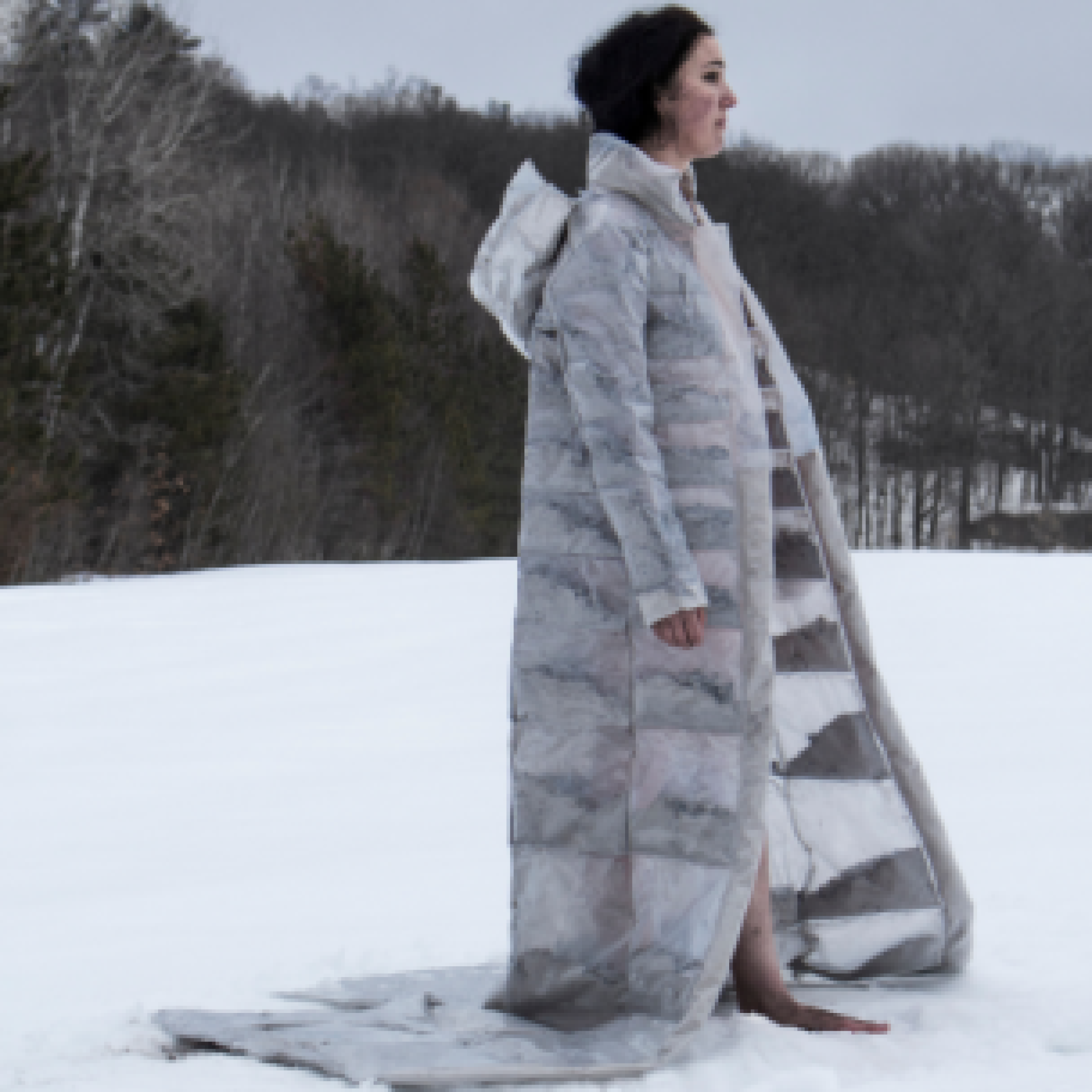 I use various materials such as burnt wood and ash, snow, vinyl, and a lot of textiles with threads, tulle, wood, nylon, and silk. For more recent projects, I have used faux fur, plastic wrappers and bags, and even medical equipment.