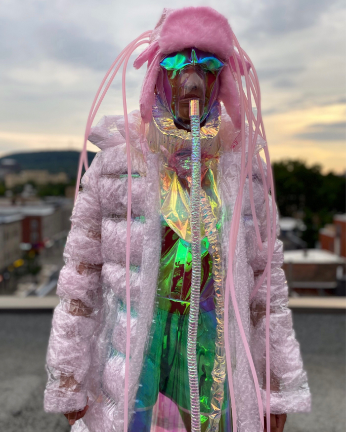 Medical equipment is surely an echo of current social distancing and questions related to limiting physical boundaries between individuals. The materials are part of the message I want to convey. I used packaging and plastic bags in the pink project to showcase overconsumption.